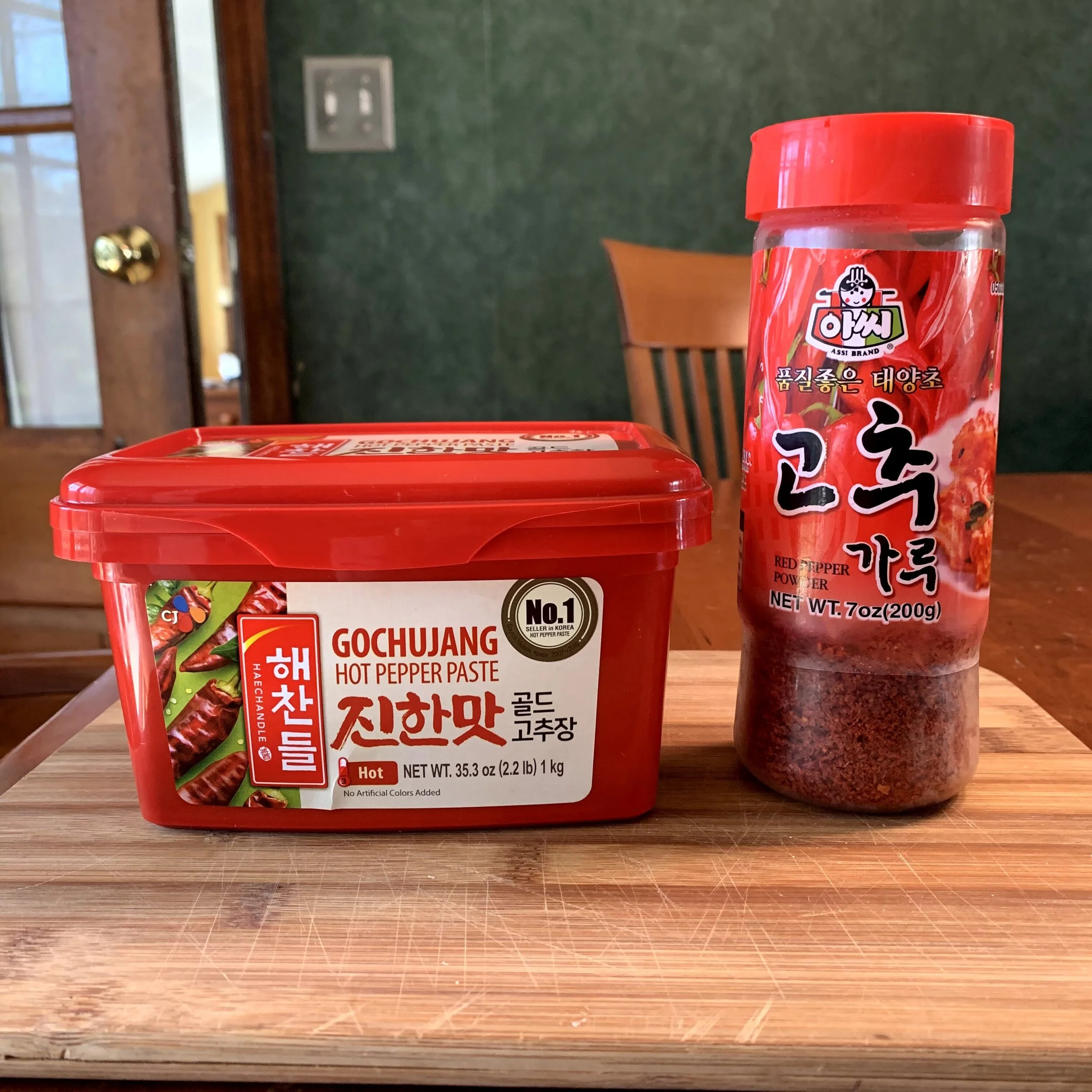 We like to use both gochugaru and gochujang even though the original recipe only calls for gochugaru. Gochugaru is a red pepper powder that is both sweet and spicy. Different brands have different levels of spice but the one we use is fairly mild. On the other hand, gochujang is a fermented red chili paste. We use a hotter variety to add additional spice to our cucumber muchim but you can totally leave out the gochujang if you would like. Depending on the brand of gochugaru and gochujang you get you may have to make your own modifications to control the level of spice.
